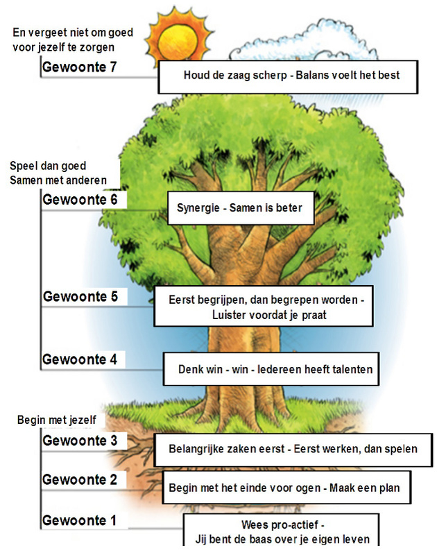 Weet je het nog? Als leidraad voor de werkwijze in de beeleidingslessen en uit eindelijk in de hele omgang met elkaar en onze schoolloopbaan houden we vast aan de theorie 8 habits of highly effective people van Stephen Covey.